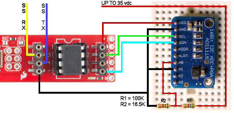 Recently a client of ours required a small microcontroller to monitor voltage from 0 to 35 volts DC with 2 decimal place accuracy. The ATTiny85 by Atmel is perfect for simple jobs like this. It is inexpensive, readily available, and small in size. The built-in 10 bit ADC of the ATiny85 wasn't going to cut it due to the large voltage range required. The ADS1115 16 bit ADC by TI seemed like a good fit and Adafruit has a development breakout board. There were some extra steps to get this working properly with the hardware development tools chosen so this article is for our reference and hopefully you may benifit from it also.