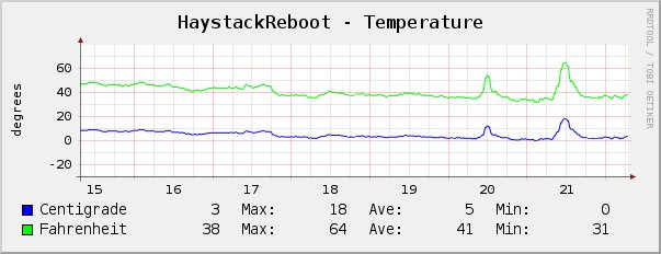 Below are screen shots of graphs made with CACTI. The graphs depict temperature and battery voltage.