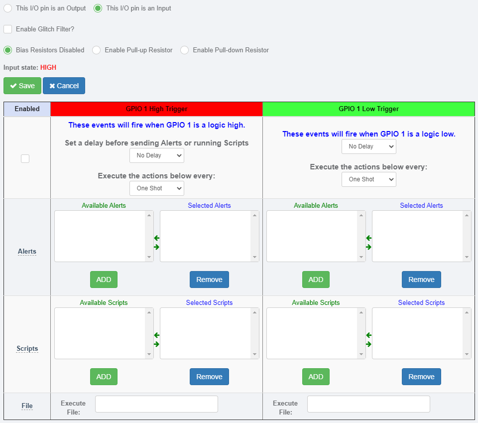 Below is a screen shot of the RMS-200v2 I/O setup page for GPIO 1 when when configured as an Input. Input pins can sense condition changes and react with alerts or scripts. Pull up and pull down bias resistors can be enabled to give the input pin a default state.
