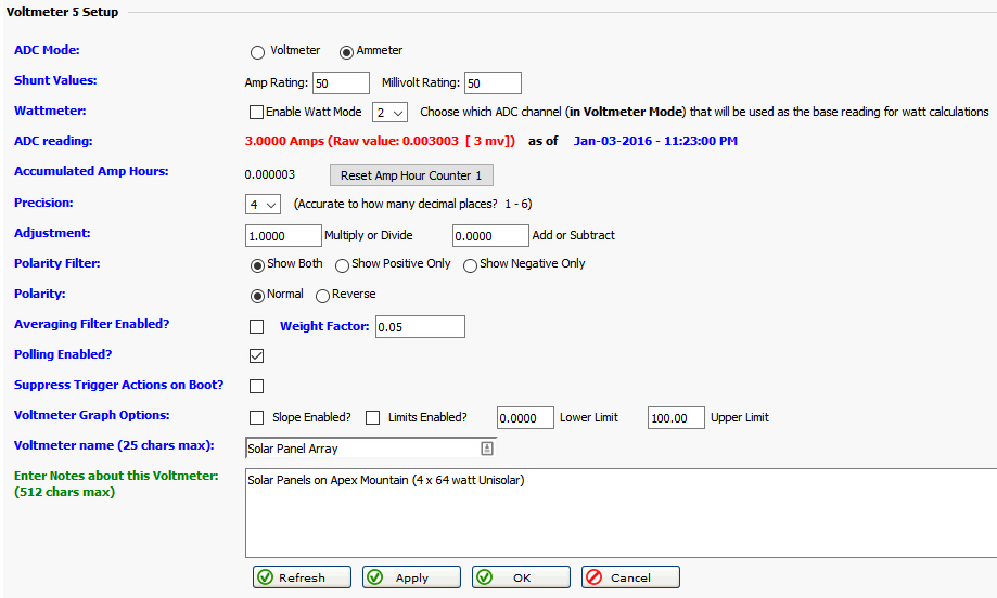 Below is a screen shot of how to setup Voltmeter 4 to act as an ammeter to show how much charging is going into the batteries from solar panels. First, put Voltmeter 4 into ammeter mode and click Apply. Next, enter valid shunt values (amperage rating, millivolt value). Set the precision to 5 or 6 decimal places. Enter the voltmeter name and notes and then click Apply or click Ok.